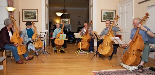 Vickie, Ursula, Els, Judith, Murray and Thomas playing 'Di Sei Bassi' on six of Richard's viols - amazing deep sound......