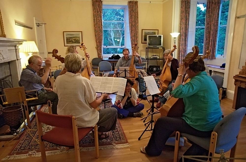 Netherurd House in the Scottish Borders - viol course with Alison Crum, Philip Thorby and Roy Marks. Ferrabosco I wrote a piece Di Sei Bassi, here played on three d-basses and three A-basses :
